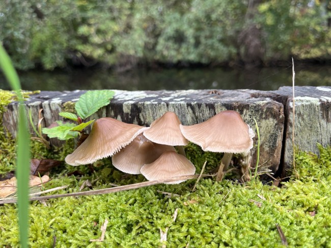 Aan de rand van de Leidse Hout loopt de Maredijk. Daar trof ik deze fraaie helmmycena (Mycena galericulata). Zoals ook hier komt hij vaak voor in groepjes op dood loofhout, al dan niet begraven. En hier dus tegen beschoeiingshout. De zwam is het gehele jaar door te vinden, maar vooral in de herfst. Als je eronder kan kijken, zie je de lamellen tussen rand en steel.