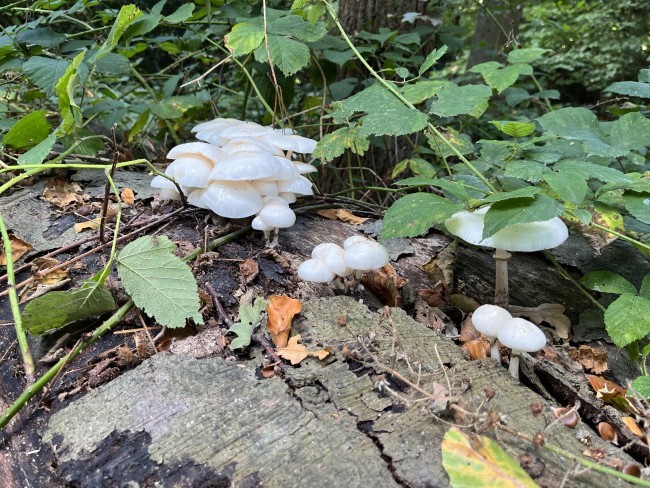 Ik wandelde nog even door naar Warmond voor een rondje door het park van Huys te Warmont. Daar trof ik de meeste van de hierboven beschreven soorten, maar ook een prachtig groepje porseleinzwammen. De porseleinzwam (Oudemansiella mucida) is prachtig wit tot ivoorkleurig en bedekt met een glimmende slijmlaag. Een genot om naar te kijken.