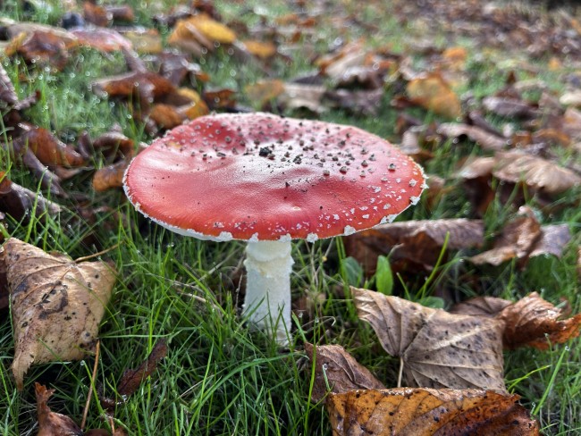 Op de terugweg in het Hofbrouckerpark in Oegstgeest zag ik de paddenstoel zoals kinderen een paddenstoel tekenen: rood met witte stippen. Je kan de vliegenzwam (Amanita muscaria) eigenlijk wel overal tegenkomen in ons land, en toch zie je hem niet zo vaak. Ze groeien in loofbossen nabij berken, tamme kastanjes, eiken en beuken, maar je ziet ze ook wel eens bij naaldbomen.