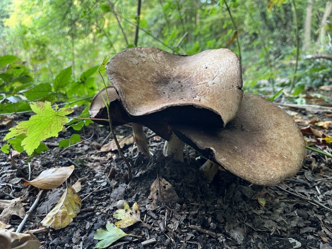 De reuzenchampignon (Agaricus augustus) die ik tegenkwam zag er heel anders uit dan versere exemplaren. Het forse vruchtlichaam (bijna 15 cm doorsnede) op de foto is al helemaal donker geworden. De soort komt vrij algemeen voor in loof- en naaldbossen. ObsIdentify gaf een 94% betrouwbaarheidsscore voor de soort reuzenchampignon, maar twee paddenstoelenexperts die ik consulteerde twijfelen eraan; zo zie je maar hoe ingewikkeld het kan zijn om de soort te determineren.