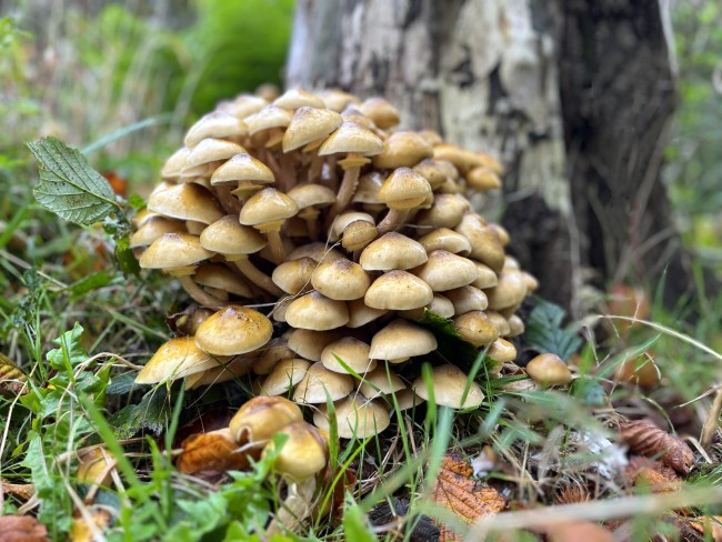 Net ten noorden van de Leidse Hout ligt het Heempark, een heerlijk oord in elk jaargetijde. Hier vond ik een mooie bundel echte honingzwammen (Armillaria mellea). Het is een uitgesproken herfstpaddenstoel, die je al gauw tegenkomt. De hoedjes zijn bruin-honingkleurig met een diameter van tussen de 2 en de 11 cm. De lengte van de steel is ongeveer anderhalf keer de diameter van de hoed.