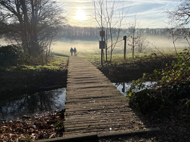 We lopen op deze zonnige winterochtend in het Renkums Beekdal. Het rondje dat we lopen is een tot ruim 10 km opgerekt Rondje Beekdal (4,3 km) en voert vanaf bezoekerscentrum Renkums Beekdal langs de Molenbeek en de Oliemolenbeek met een uitstapje langs de grafheuvels van de Keijenberg en de Paradijsspreng. Bijna de hele route is onverhard. Het beekdal is natuurgebied geworden nadat de papierfabriek daar is gesloten en gesloopt; een monument herinnert nog aan die industriële periode. De route komt voor een flink deel overeen met het Hartensepad Klompenpad dat 14 km lang is.