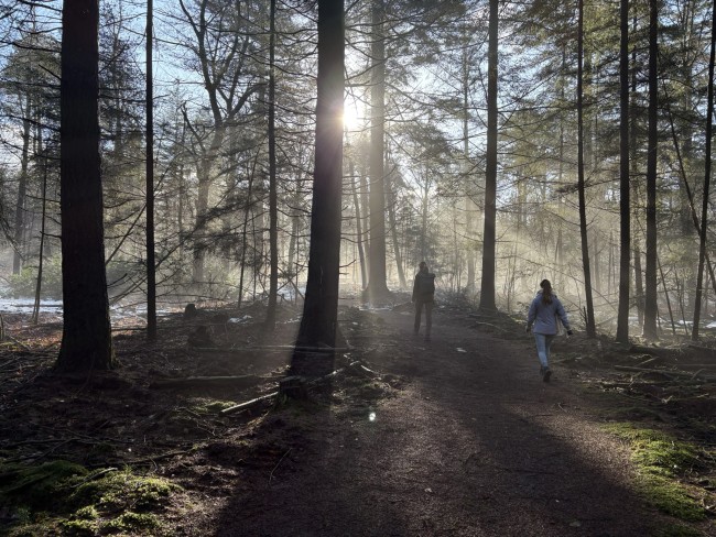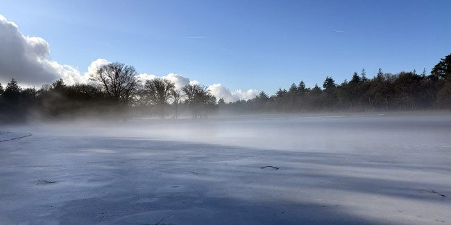 Vandaag wandelden wij de rondwandeling Jachthuis Sint Hubertus vanaf het Park Paviljoen, een route van 8,7 kilometer. Zeker vandaag was dat geweldig: er lag nog wat sneeuw, maar de paden waren prima te belopen. Al kort na onze start kwam de zon door, wat samen met de opdampende mist tot prachtige lichtpartijen leidde. Halverwege deze wandeling kom je langs Jachthuis Sint Hubertus, waar je in de Theekoepel wat kan drinken en eten. Aan het begin of eind van de wandeling kan dat ook in het Parkrestaurant. Al wandelend vertellen Margo en Eva uitgebreid over De Hoge Veluwe.
