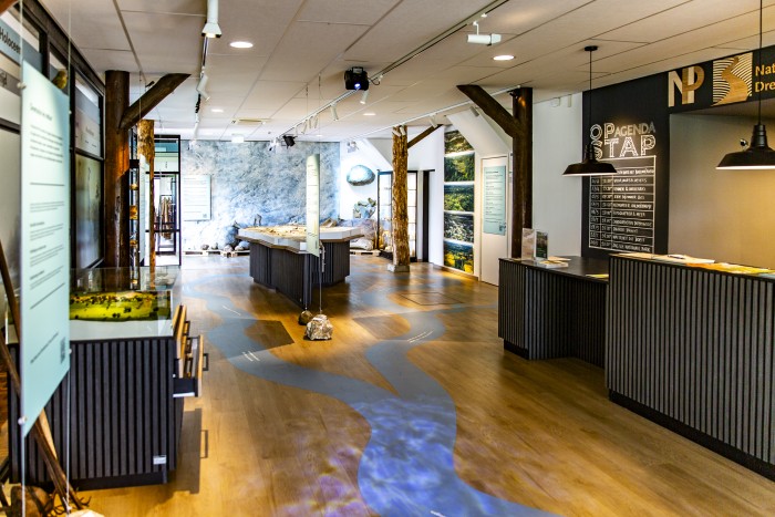 In het bezoekerscentrum kun je de tijdlijn van de Drentsche Aa volgen. “Je gaat van de ijstijden naar het esdorpenlandschap tot de situatie van nu”, legt André uit. "De vitrines met vondsten uit de ijstijden en oude menselijke gebruiksvoorwerpen zijn ingericht in samenwerking met het Hunebedcentrum en het Drents Museum." Opvallend centraal element is de maquette van het gebied waarop je ook het reliëf met de ruggen en de beekdalen kunt zien. Op de grond ligt een schematische weergave van het watersysteem. Aan de wand hangt een grote kaart met bezienswaardigheden, beeklopen, infocentra, gebiedsnamen en nog veel meer. Aan de overkant van de wandkaart hangt een digitale kaart, waarmee je meer de diepte in kunt door middel van verschillende 'lagen' die tevoorschijn komen als je verder inzoomt. Op deze kaart vind je o.a. de wandelknooppunten, maar die staan ook op een bord buiten bij de parkeerplaats.