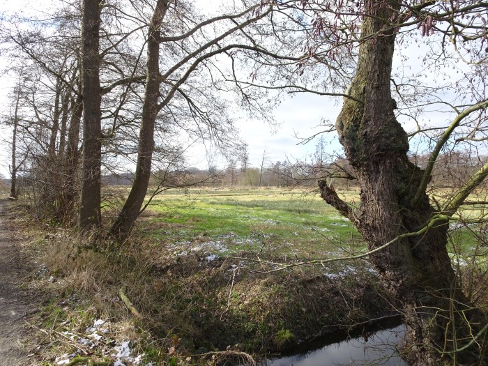 Vanaf het bezoekerscentrum gaat een recht onverhard pad met elzensingels erlangs het gebied in. Je moet eigenlijk steeds naar rechts kijken, want dan heb je zicht op het beekdal. Zelfs in de winter kun je al van mooie plaatjes genieten, maar in voorjaar en zomer zal het hier een kleurig geheel zijn en kun je veel meer planten en dieren waarnemen. Het is bijvoorbeeld een zeer geschikt gebied voor ooievaars die vlakbij het bezoekerscentrum een nest hebben.
