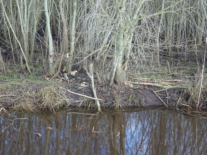 Als ik na een paar kilometer de brug over het Deurzerdiep over gegaan ben, staat er een wilgenbosje aan de overkant van een klein zijbeekje. Een mooi leefgebied voor bevers. Op de oever zie ik inderdaad duidelijk sporen van de dieren: verse knaagsporen en glijsporen waar de dieren in en uit het water gegaan zijn.